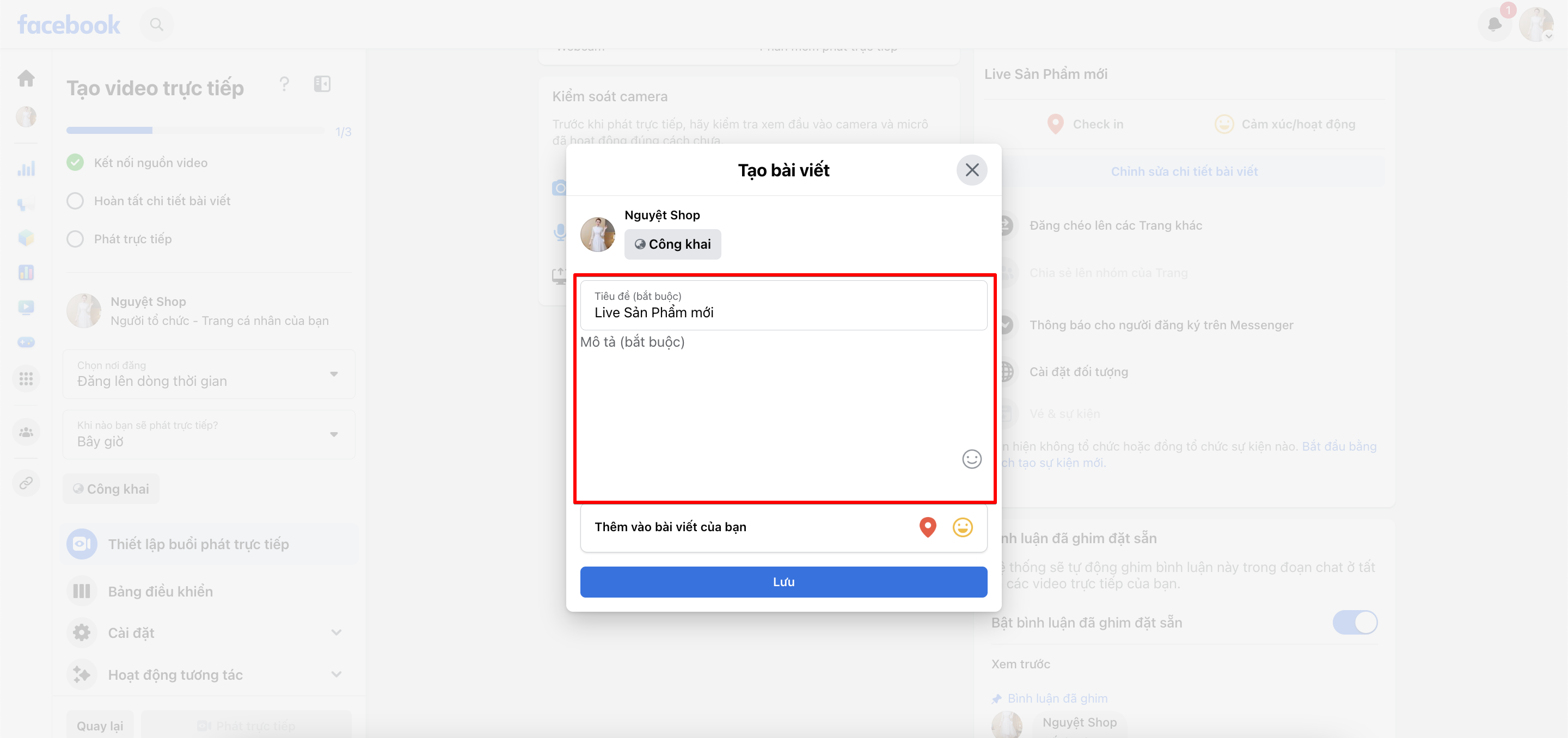 - Có một số trường hợp bạn đã thực hiện kết nối nguồn video, có tiêu đề bài viết nhưng không thể phát trực tiếp. Bạn cần lưu ý chi tiết bài viết cần bắt buộc điền đầy đủ nội dung Tiêu đề + Mô tảthì hệ thống mới cho phép phát trực tiếp.