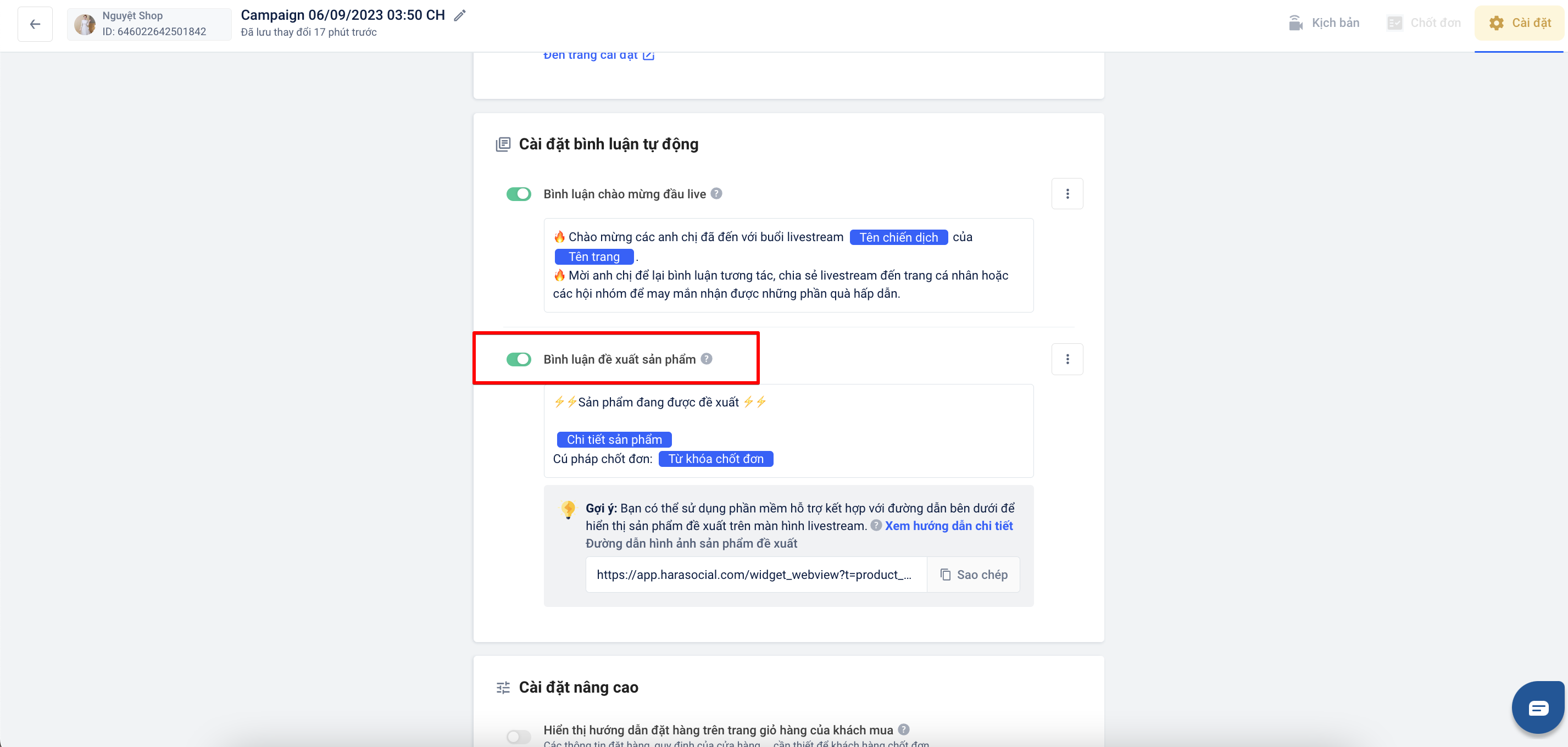 Bạn cần lưu ý kích hoạt công cụ đề xuất sản phẩm để khi thiết lập tích hợp công cụ Prism Live thì tại Harasocial mới hiển thị nút ghim sản phẩm.