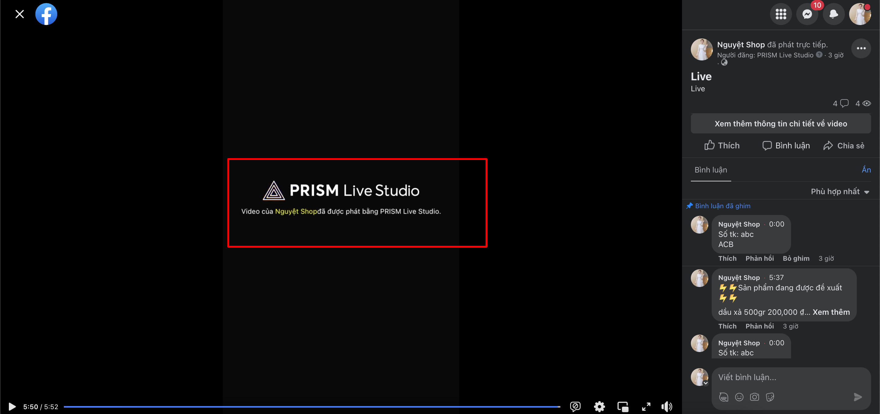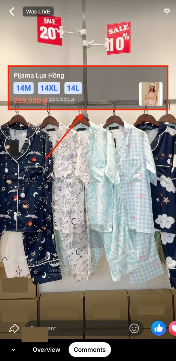 Khi thiết lập công cụ Prism Live Studio để hỗ trợ vận hành bán hàng qua Livestream Facebook, nhà bán hàng cần quan tâm đến trải nghiệm mua hàng thực tế của người tiêu dùng. Theo đó, khi chèn sản phẩm đề xuất bằng Prism Live Studio, người mua hàng sẽ thấy sản phẩm hiển thị trên Livestream như sau: