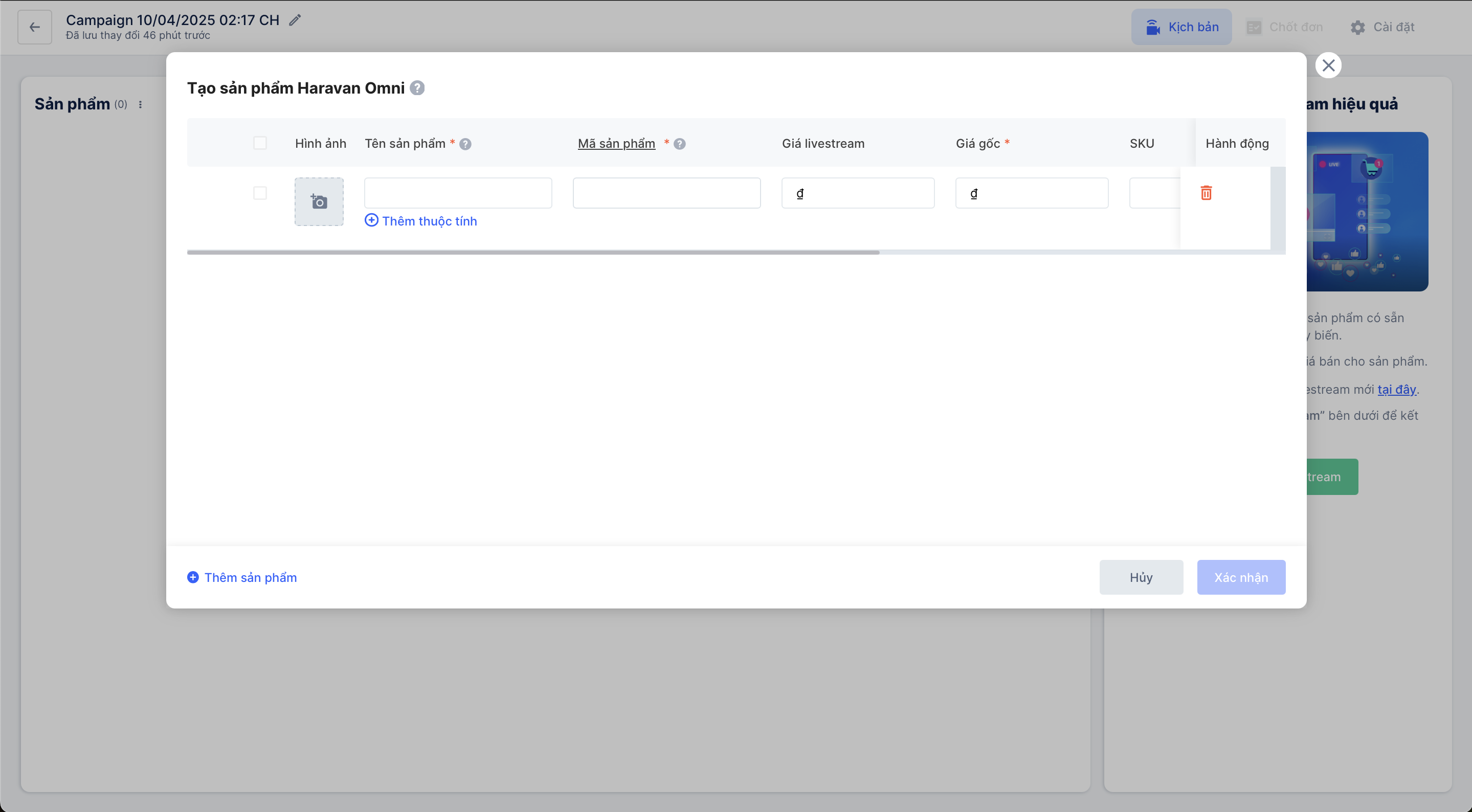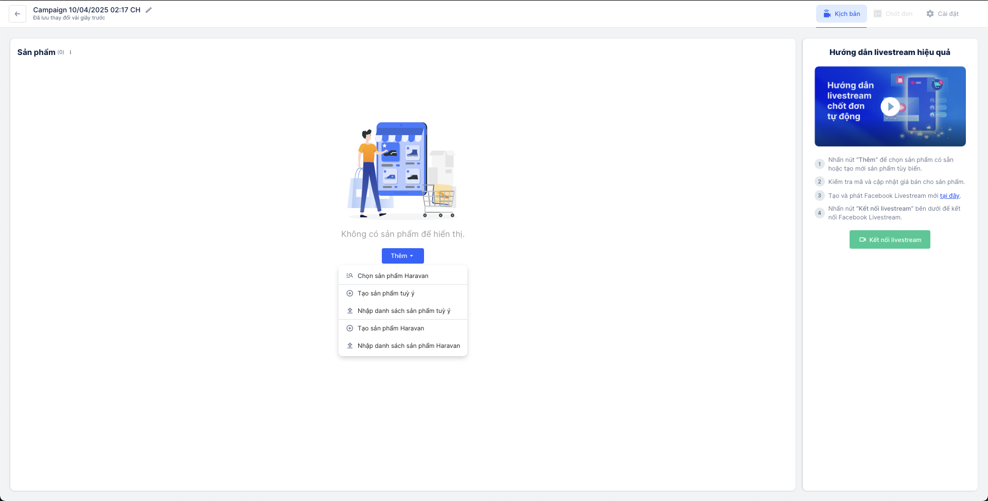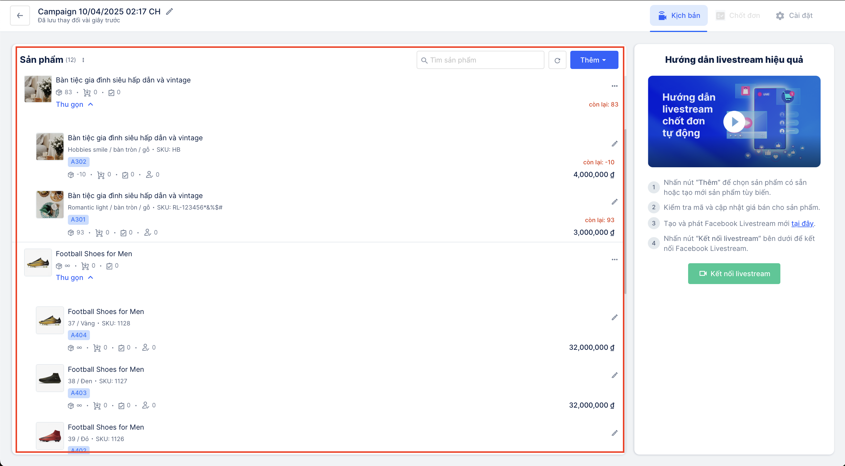 Và đây là kết quả sau khi hoàn tất việc thêm sản phẩm vào chiến dịch Livestream: