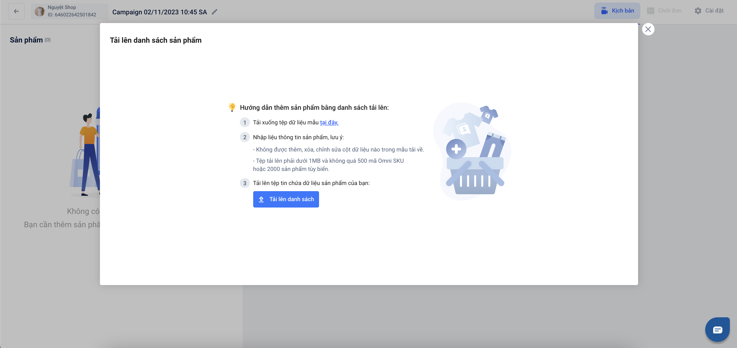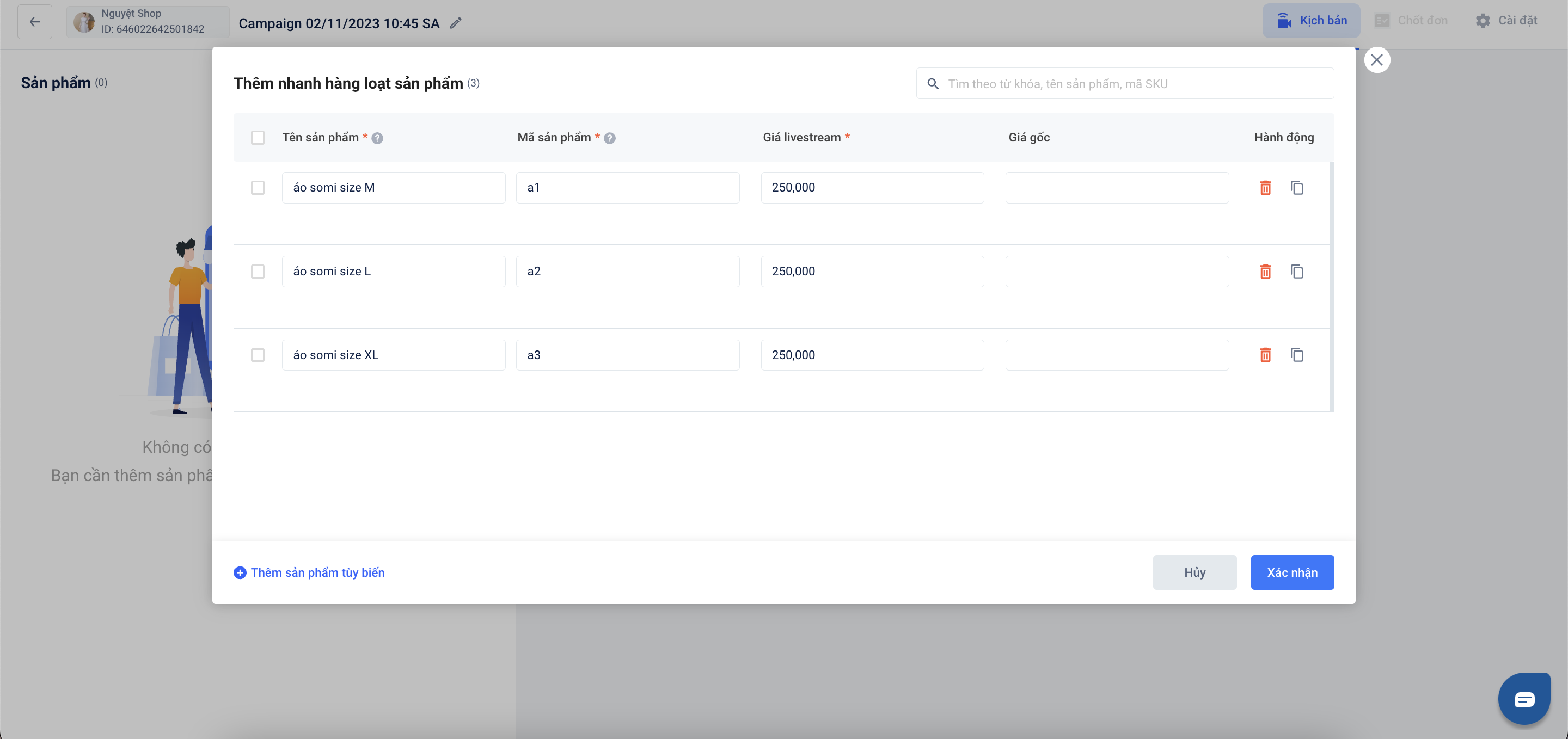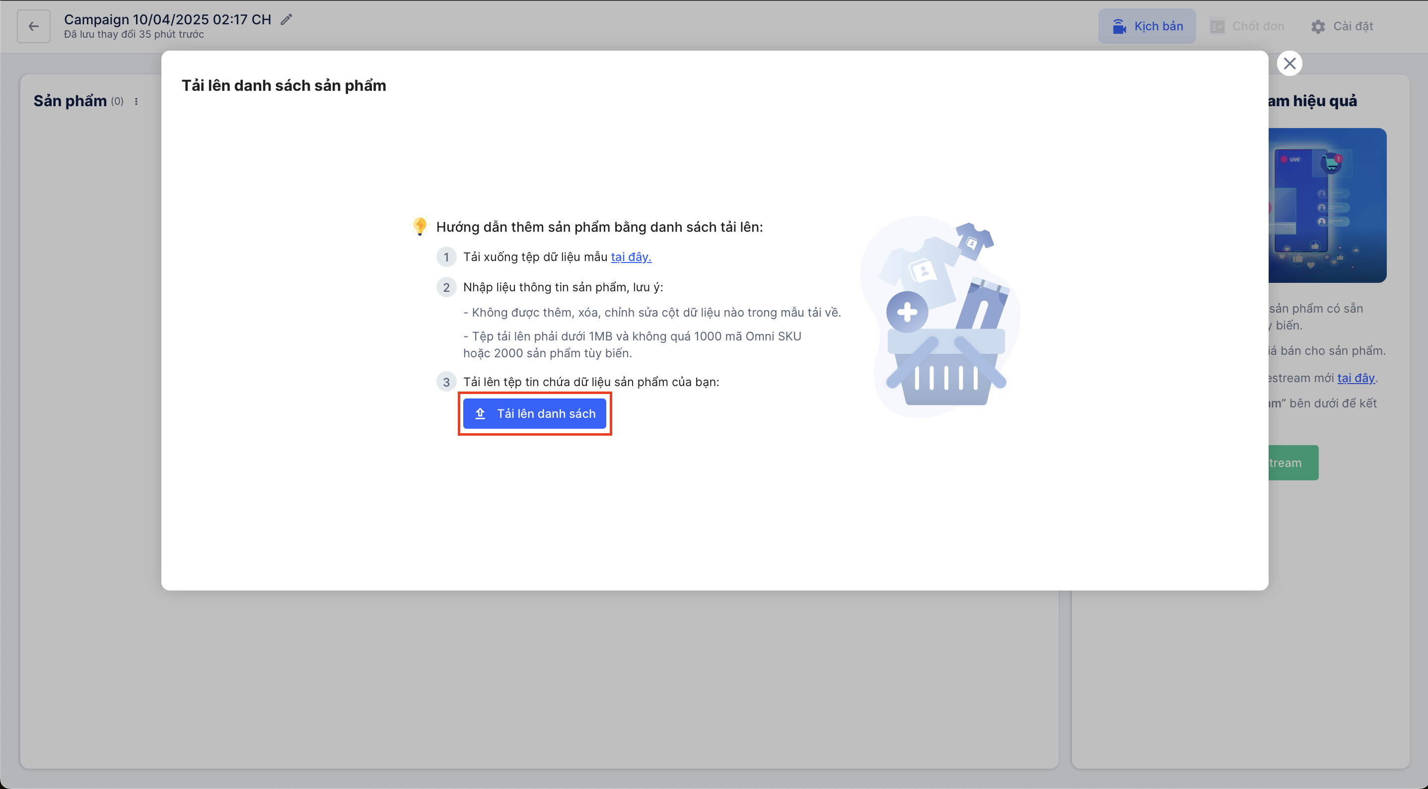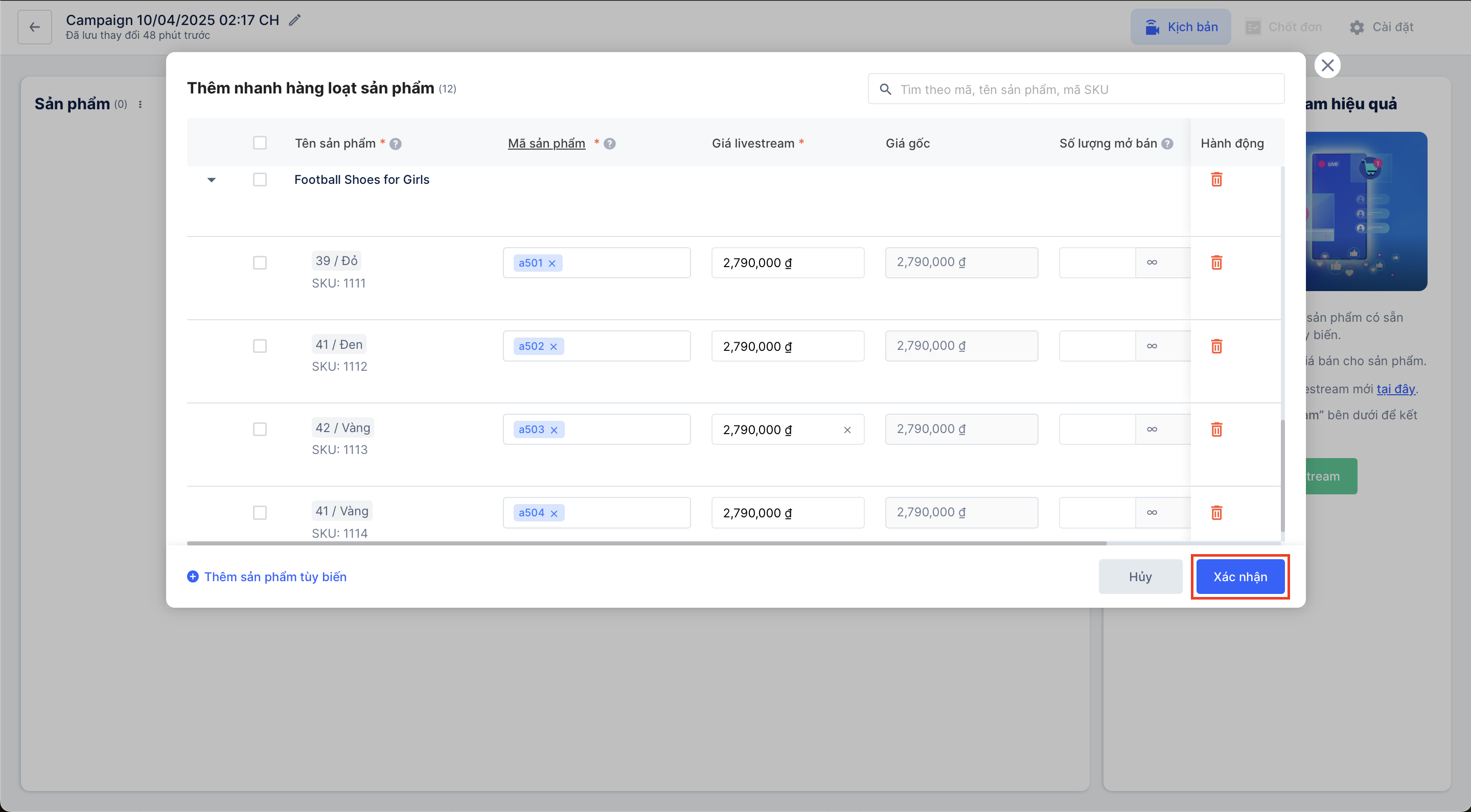 Hướng dẫn thêm nhanh hàng loạt sản phẩm vào chiến dịch Livestream