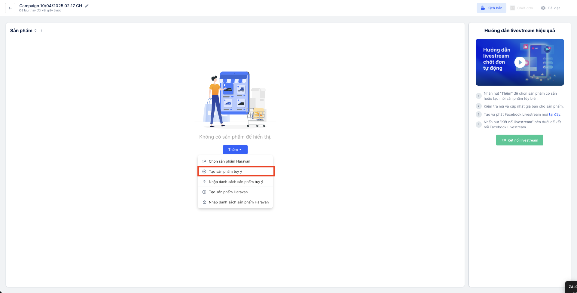 Sau đó, bạn cần nhấn vào nút "Thêm" để thêm sản phẩm vào chiến dịch. Tại đây, có 3 cách thức để bạn có thể thêm sản phẩm hàng loạt vào chiến dịch Livestream: Chọn sản phẩm Haravan, Tạo sản phẩm tuỳ ý và Tạo sản phẩm Haravan.