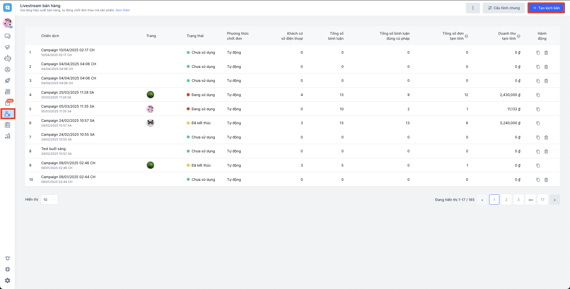 Đầu tiên, bạn truy cập vào chức năng Livestream, nhấn nút "Tạo kịch bản" để bắt đầu tạo một chiến dịch Livestream.