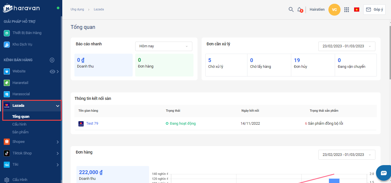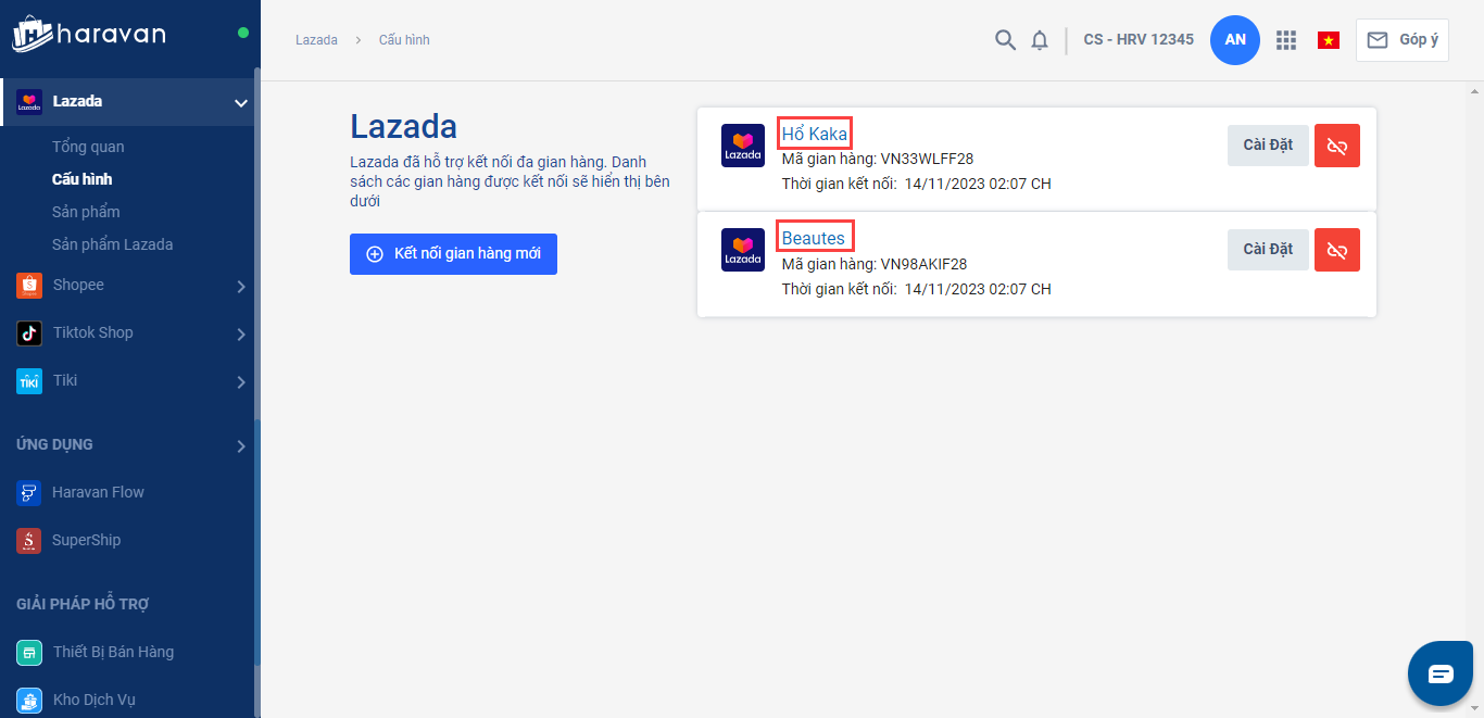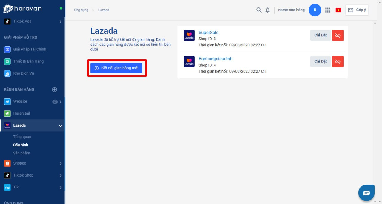| Thông tin kết nối sàn | Thông tin về các gian hàng Lazada đã kết nối với Haravan |