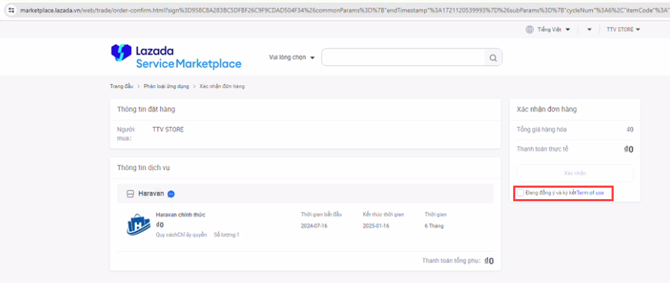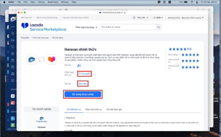 Tại trang Lazada Service Marketplace, tích chọn Chỉ ủy quyền và Nửa năm-> chọnSử dụng được phép