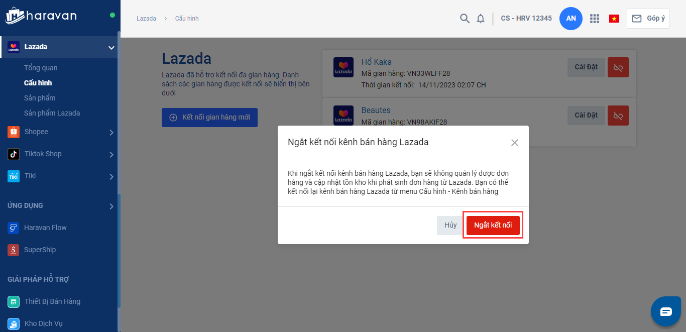 Để thực hiện ngắt kết nối với Lazada, nhà bán hàng thực hiện theo các bước: