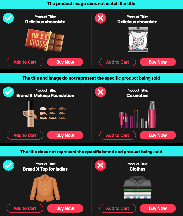 Cả tên sản phẩm và hình ảnh phải đại diện cho sản phẩm cụ thể đang được bán.