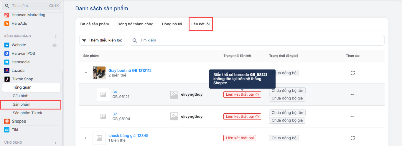 - Liên kết lại sản phẩm bị lỗi liên kết hoặc lỗi đồng bộ