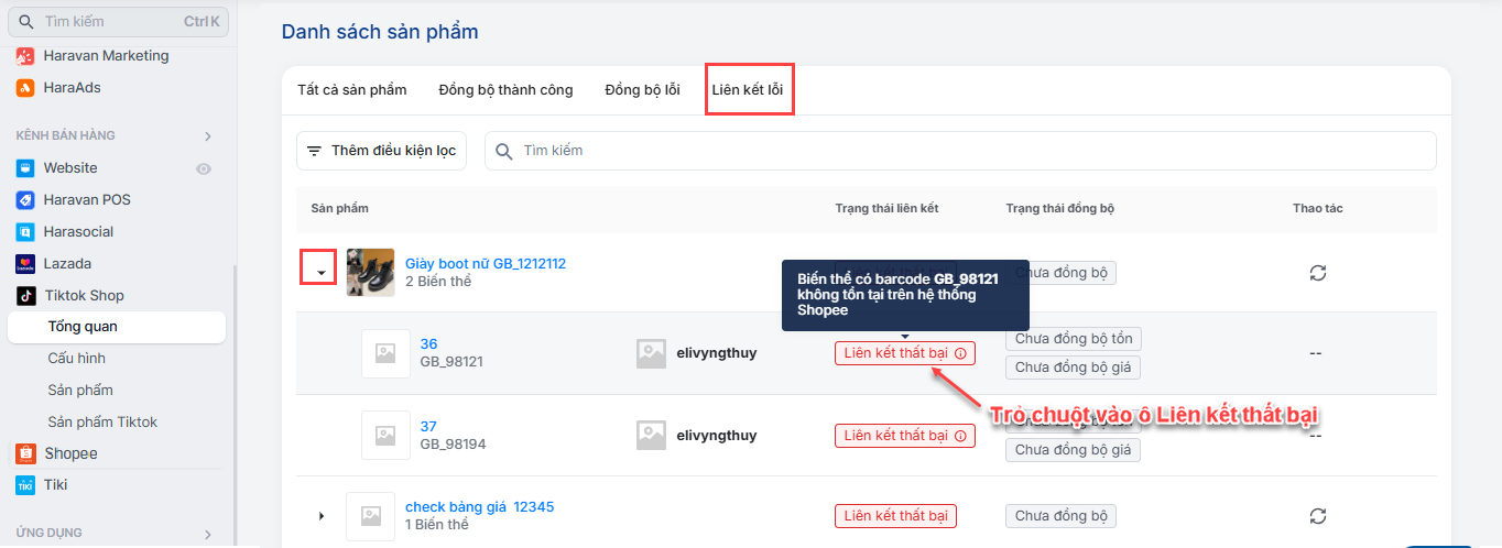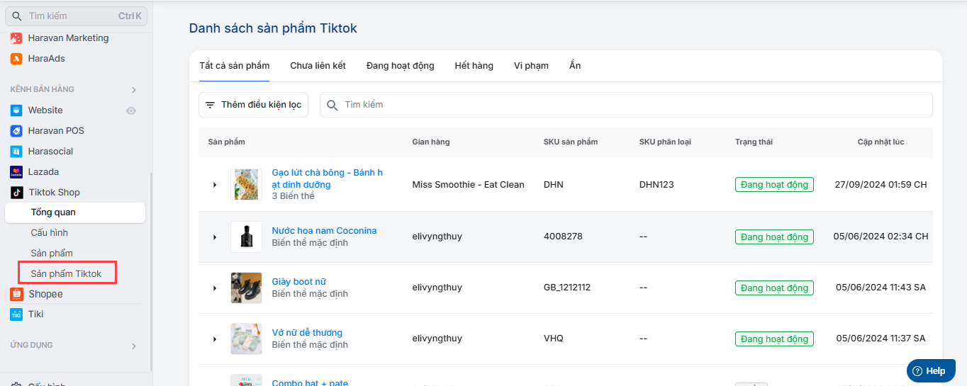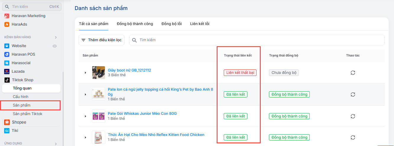 Kiểm tra kết quả liên kết và đồng bộ sản phẩm Haravan và Tiktok Shop
