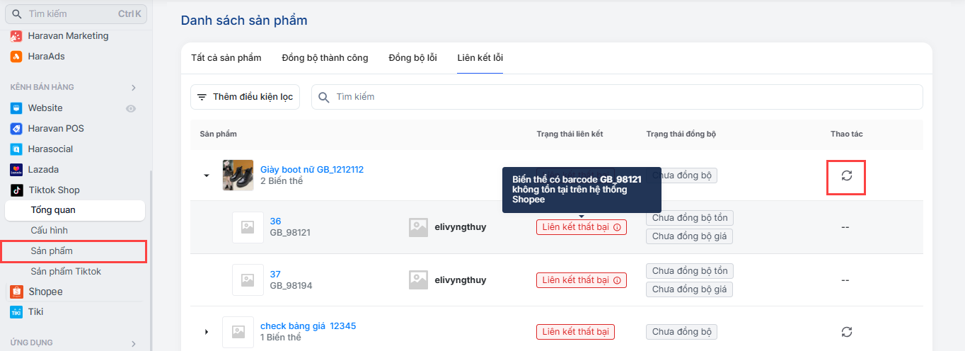 2. Chọn nút đồng bộ lại tại sản phẩm bị lỗi liên kết, lỗi đồng bộ.