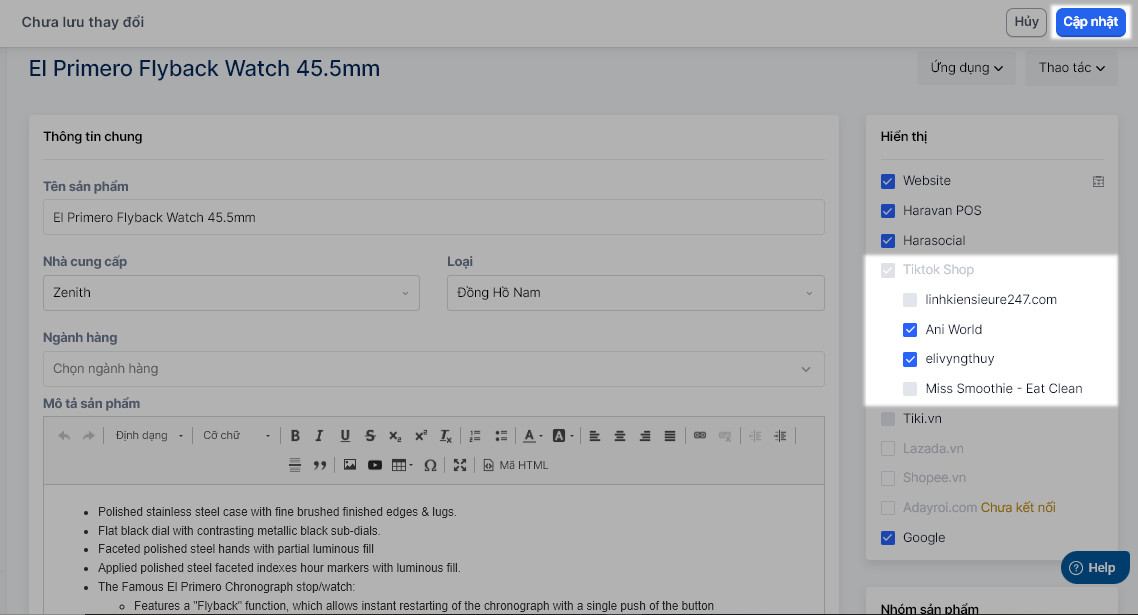 Hoặc bạn có thể vào trang chi tiết sản phẩm, ở mục Hiển thị, bạn chọn gian hàng Tiktok shop muốn đăng sản phẩm lên.