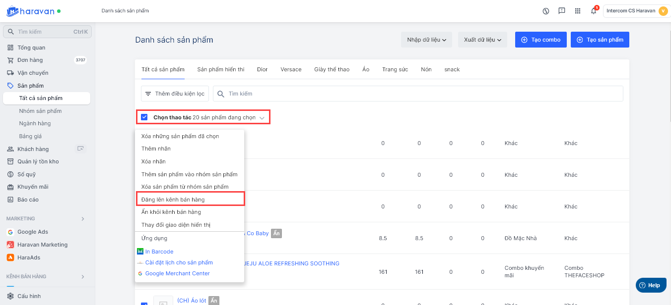 - Tại mục Tất cả sản phẩm, bạn chọn các sản phẩm cần liên kết và chọn Thao tác
