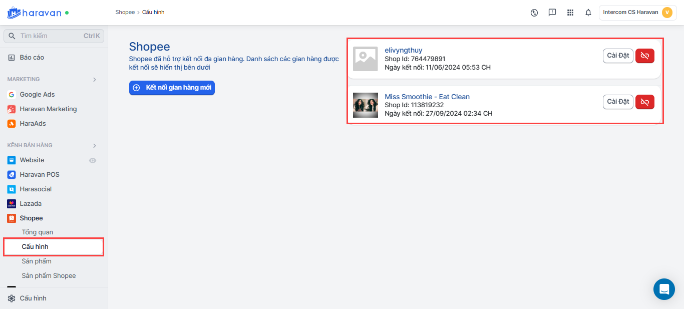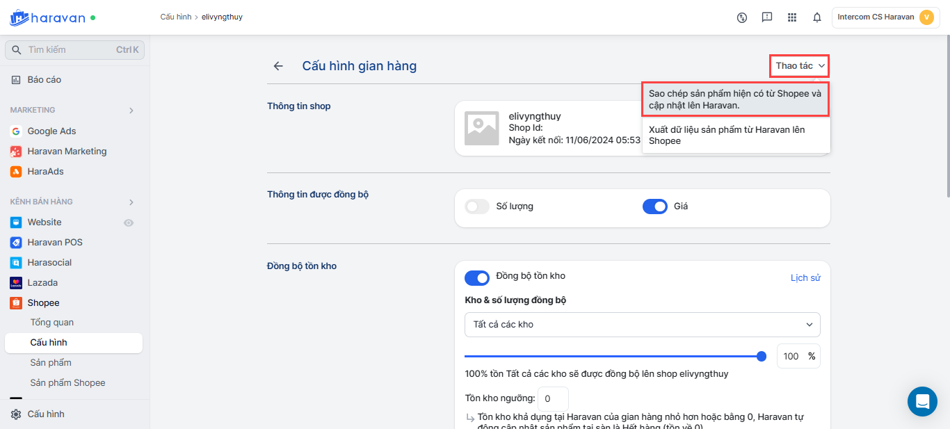 Bước 2: Tại trang Cấu hình gian hàng, bạn chọn Thao tác -> chọn Sao chép sản phẩm hiện có từ Shopee và cập nhật lên Haravan