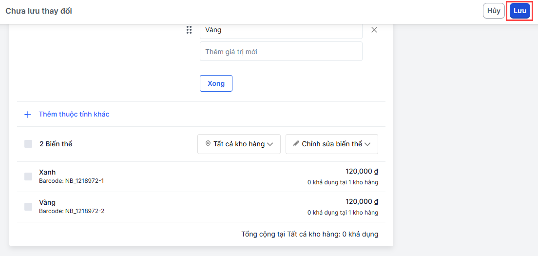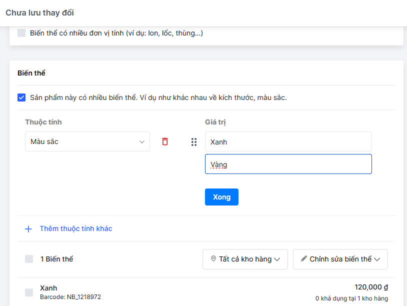 - Với sản phẩm có nhiều biến thể, nhà bán chọn biến thể, nhập tên thuộc tính và giá trị thuộc tính.