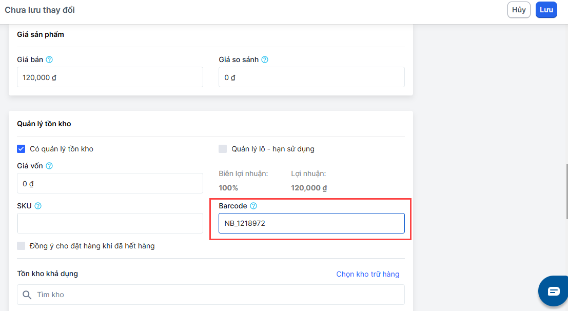 3. Nhập các trường thông tin liên quan như tên, giá bán, đặc biệt là barcode sản phẩm