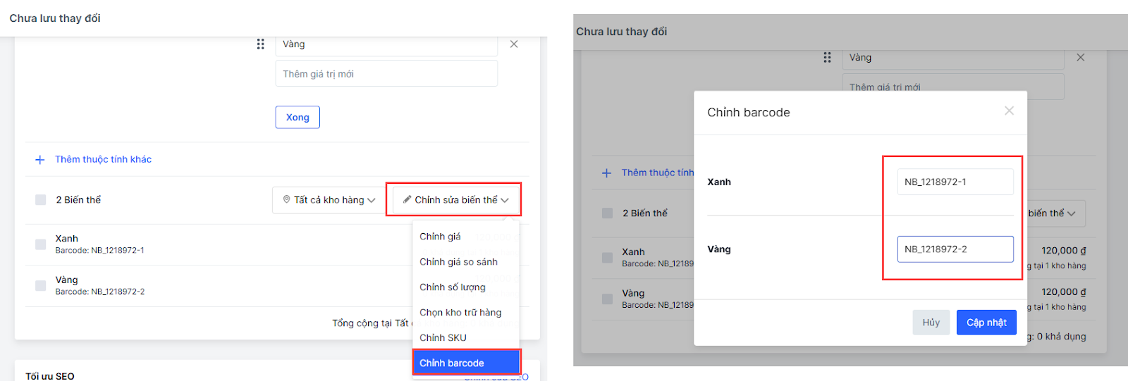 - Nhà bán có thể chọn Chỉnh sửa biến thể để thay đổi barcode cho biến thể