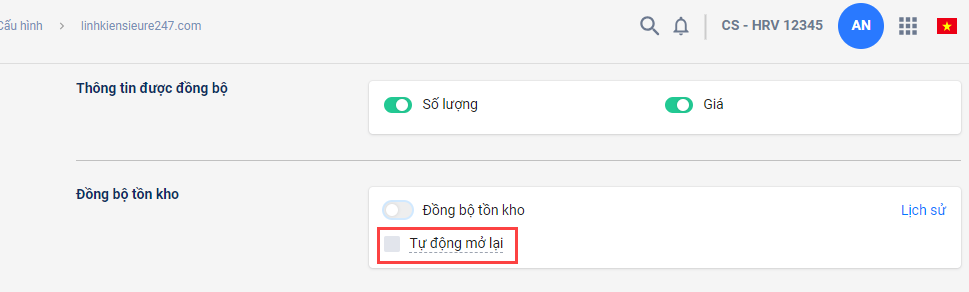 Nhà bán hàng cũng có thể tắt tồn kho khi nhà bán hàng muốn dừng việc đồng bộ tồn kho. Với lựa chọn này, nhà bán có thể thiết lập thời gian tự động kích hoạt chế độ đồng bộ lại.
