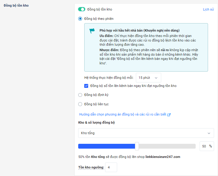 | Nhà bán hàng dùng 1 kho chung cho các sàn | Chọn chế độ đồng bộ tồn kho liên tục và điều chỉnh tỉ lệ đồng bộ xuống tầm 50 đến 60%. |