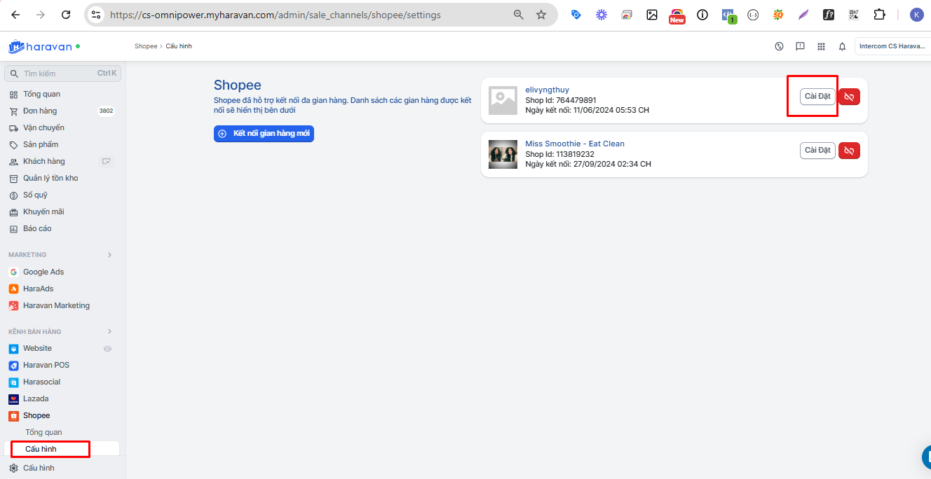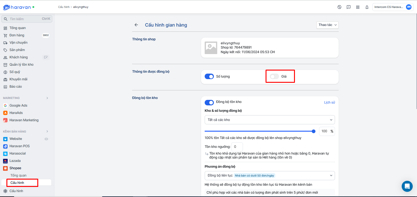 Vào cấu hình liên kết sàn tại Haravan -> Bỏ stick đồng bộ giá