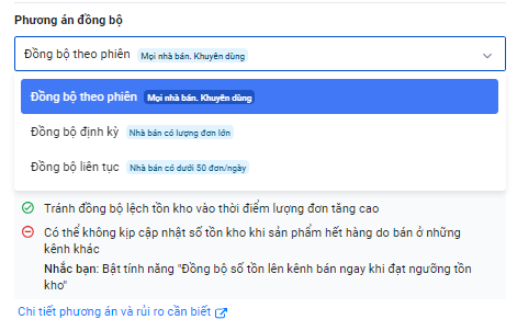 - Đồng bộ liên tục: liên tục đồng bộ tồn kho từ Haravan qua sàn thương mại điện tử. Chế độ này sẽ phù hợp với shopchưa có nhiều đơn hàng** từ sàn hoặc mới bắt đầu mở bán trên kênh sàn thương mại điện tử**