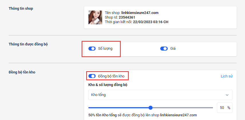 Tuy nhiên, để thông tin tồn kho được cập nhật từ Haravan qua sàn khi có thay đổi (trừ tồn, số tồn được nhập mới hoặc kiểm kho,...), bạn cần thiết lậpđồng thời Thông tin đồng bộ Số lượng và kích hoạt Đồng bộ tồn kho.