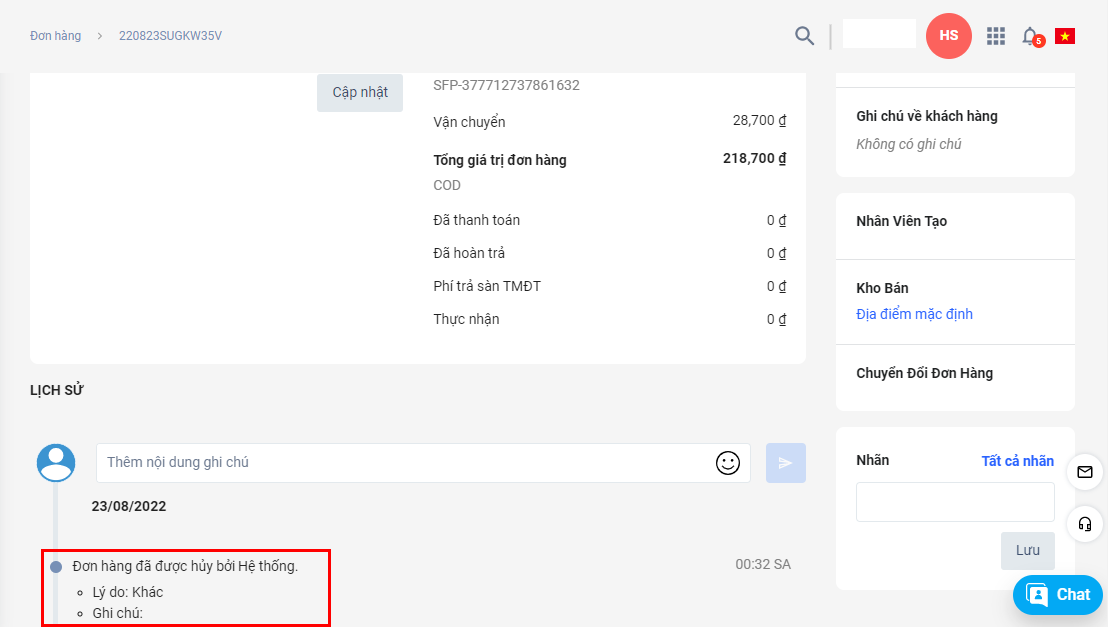Hệ thống tự động nhập kho sản phẩm trong đơn hàng hủy. Khi vào đơn hàng bị hủy, bạn sẽ thấy dòng thông báo đã nhập kho sản phẩm trong mục lịch sử đơn hàng. Tuy nhiên,**chỉ nhập kho**khi đơn hàng**hủy ở trạng thái Chờ giao hàng và Chờ lấy hàng.**Đơn đã chuyển sang trạng thái Đang giao hàng mà hủy đơn, hệ thống sẽ không tự nhập kho, nhà bán hàng phảitự thực hiện hoàn trả sản phẩm trên đơn. Xem hướng dẫn tại đây.