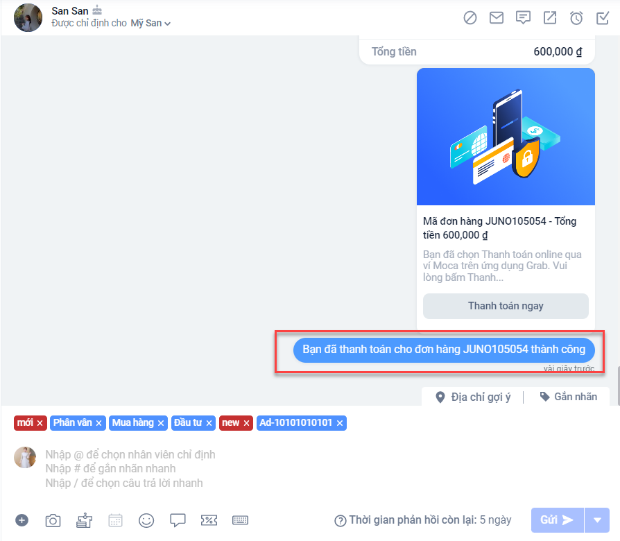 Khi hệ thống ghi nhận khách hàng đã thanh toán thành công, hệ thống sẽ gửi tin nhắn thông báo xác nhận khách hàng đã thanh toán đơn hàng thành công với nội dung tin nhắn: "Bạn đã thanh toán cho đơn hàng [Mã_đơn_hàng] thành công."