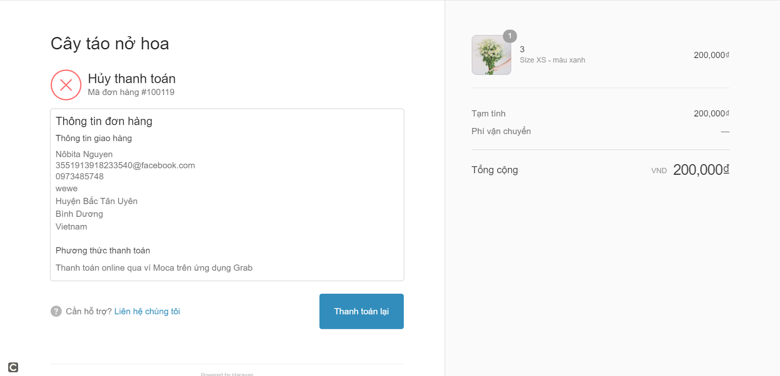 - Nếu thanh toán bị lỗi, khách hàng có thể chọn thanh toán lại bằng cách nhấn vào nút "Thanh toán lại". Hoặc có thể trở về tin nhắn của shop và nhấn vào nút "Thanh toán ngay" trên thẻ thông tin thanh toán để bắt đầu lại luồng thanh toán.