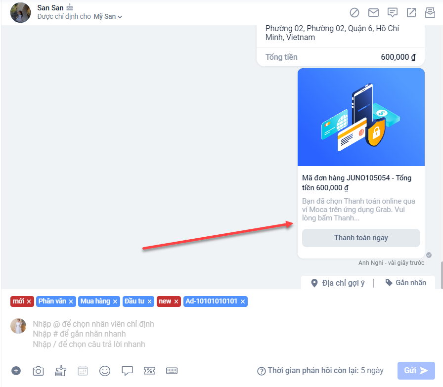 - Link thanh toán chỉ gửi khi tạo đơn hàng trên hội thoại tin nhắn. Với đơn hàng được tạo từ hội thoại bình luận, nếu khách hàng đã có hội thoại tin nhắn trên hệ thống thì link thanh toán sẽ được gửi vào hội thoại tin nhắn của khách hàng.