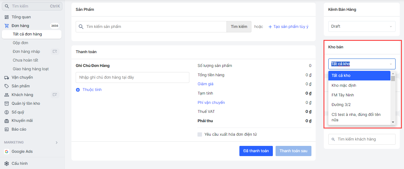 Bước 2: Chọn Kho bán cho đơn hàng. Nếu không chọn kho bán, đơn hàng sẽ ghi nhận kho bán là kho mặc định.