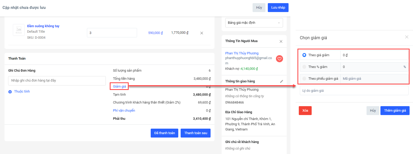 Bước 6: Thêm Giảm giá trên đơn hàng (nếu có). Bạn có thể thiết lập giảm theo số tiền, giảm theo phần trăm hoặc áp mã khuyến mãi đã tạo trên trang admin cho đơn hàng.