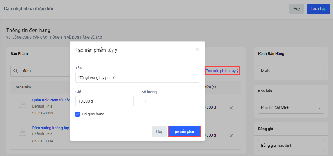 Nếu bạn muốn thêm sản phẩm tặng, bạn có thể Tạo sản phẩm tùy ý. Sản phẩm tùy ý sẽ không được ghi nhận là sản phẩm mới trong danh sách dữ liệu admin Haravan.