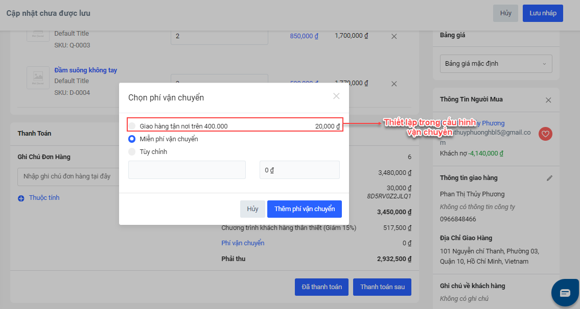 - Phí vận chuyển đã thiết lập trong Cấu hình Vận chuyển.