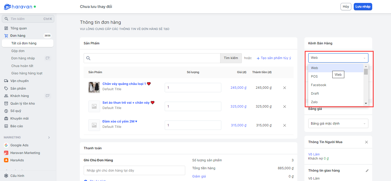 Bước 5: Thêm Kênh bán hàng. Khi tạo đơn trên admin Haravan, kênh bán hàng mặc định là kênh draft. Tuy nhiên, bạn có thể chọn lại kênh bán khác trong danh sách.