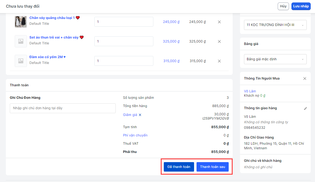 Bước 8 Chọn Hình thức thanh toán cho đơn bao gồm: Đã thanh toán và Thanh toán sau. Chọn Đã thanh toán để tạo đơn thanh toán trước hoặc chọn Thanh toán sau để tạo đơn chưa thanh toán.