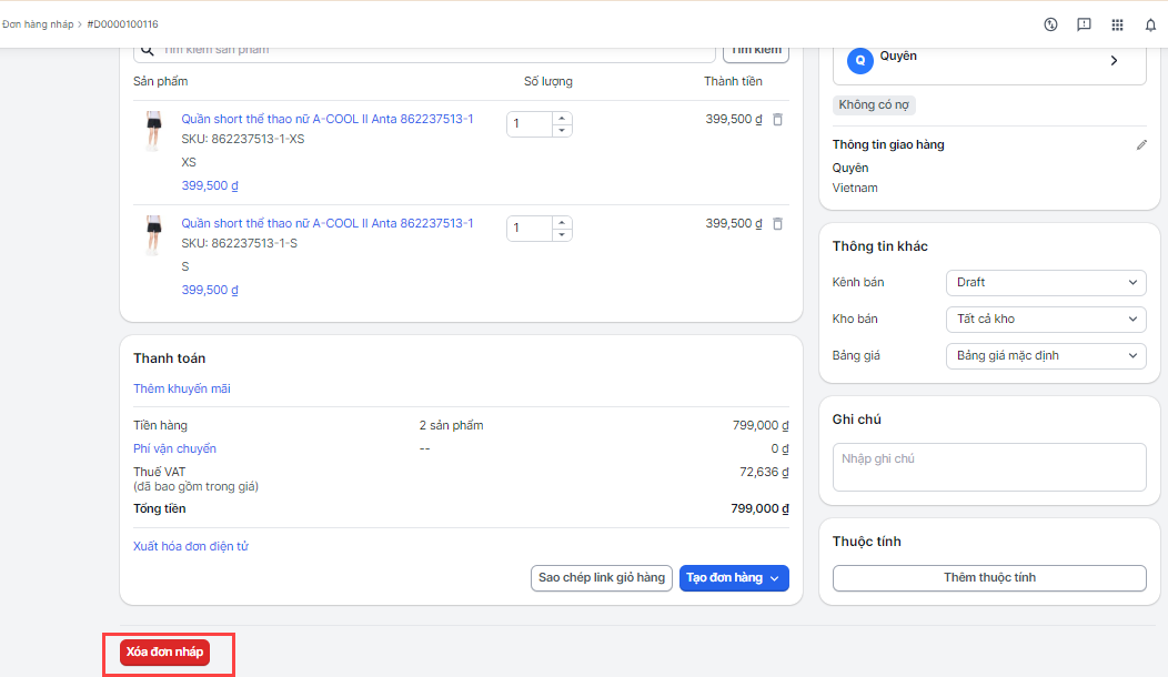 Trong trang chi tiết của đơn hàng nháp, nhấn chọn Xóa đơn hàng, và nhấn chọnĐồng ýđể xác nhận lại trong cửa sổ cảnh báo.
