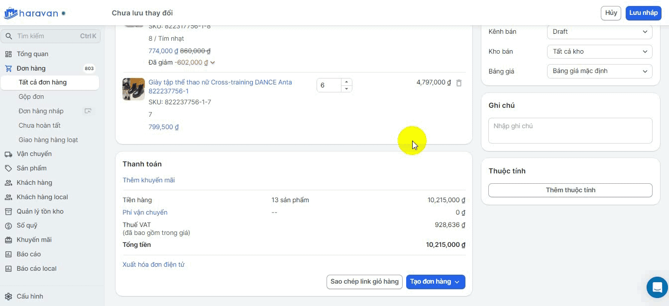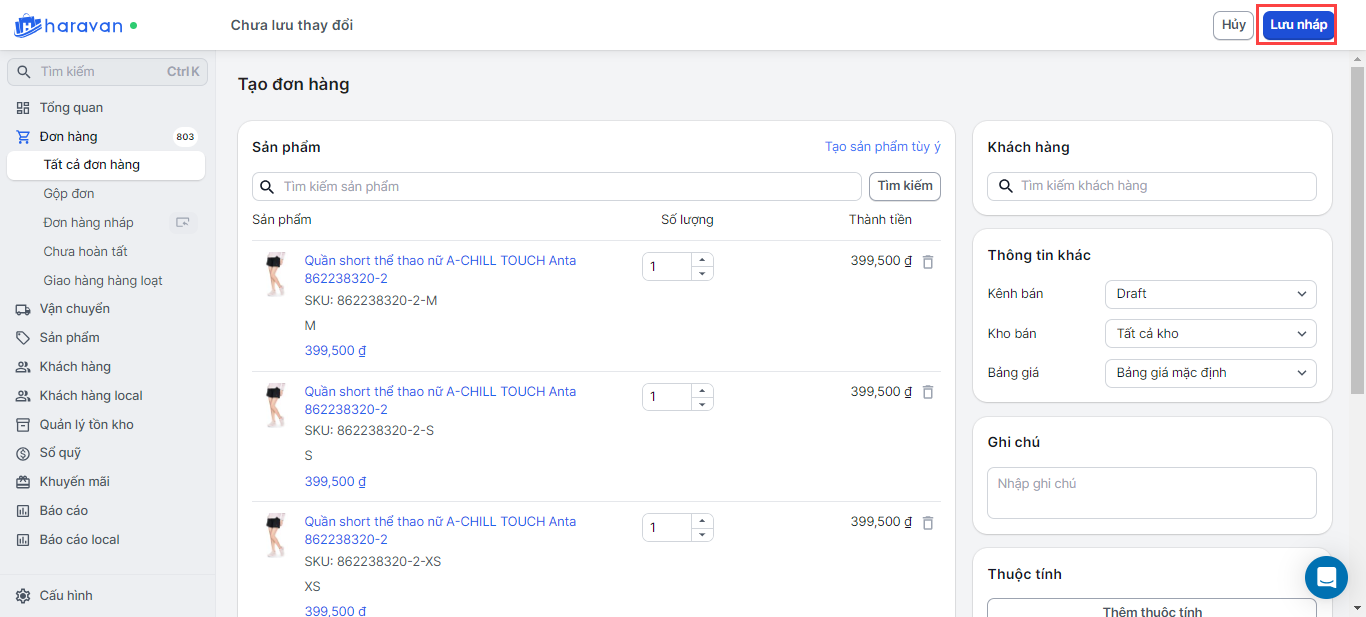 Nhà bán vào mục Đơn hàng và chọnTạo đơn hàng mới. Sau khi đã thêm thông tin, nhà bán chọn Lưu nháp.