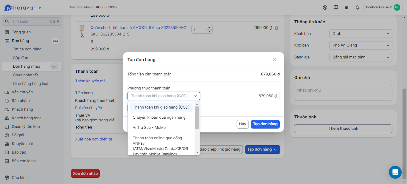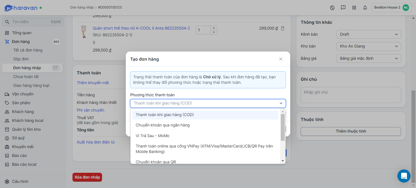 Khi bạn thực hiện cập nhật thanh toán cho đơn hàng nháp, một đơn hàng mới từ sẽ được tạo từ đơn hàng nháp và đơn hàng nháp sẽ chuyển sang trạng thái Đã hoàn thành.