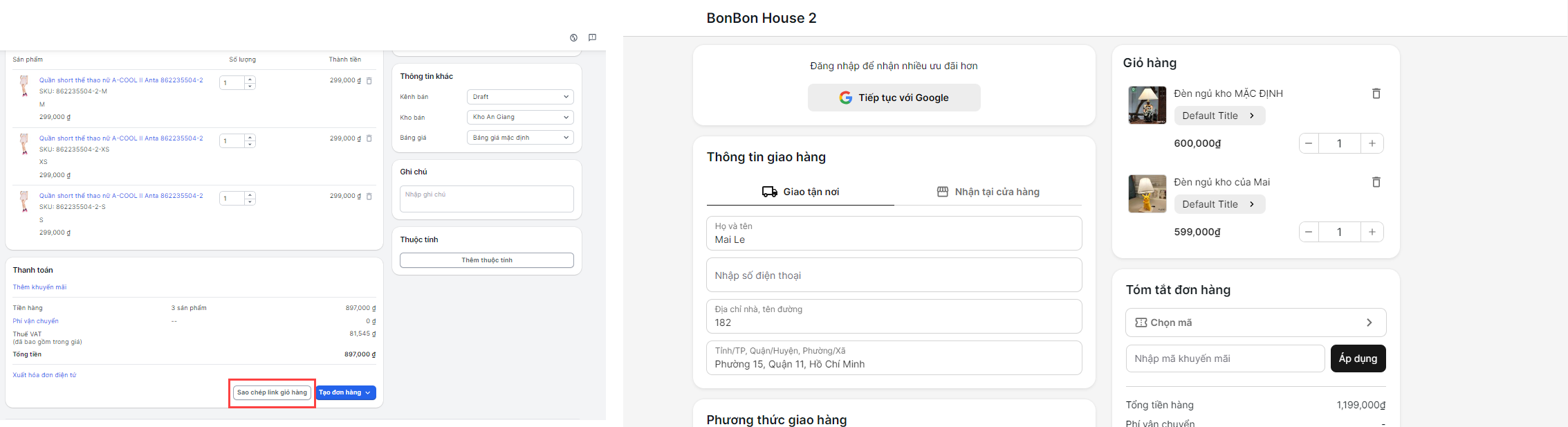 3. Nhà bán có thể chọnsao chép link giỏ hàng và gửi cho khách**hàng** để kiểm tra lại thông tin. Người mua có thể xác nhận tạo đơn ngay trên link này.