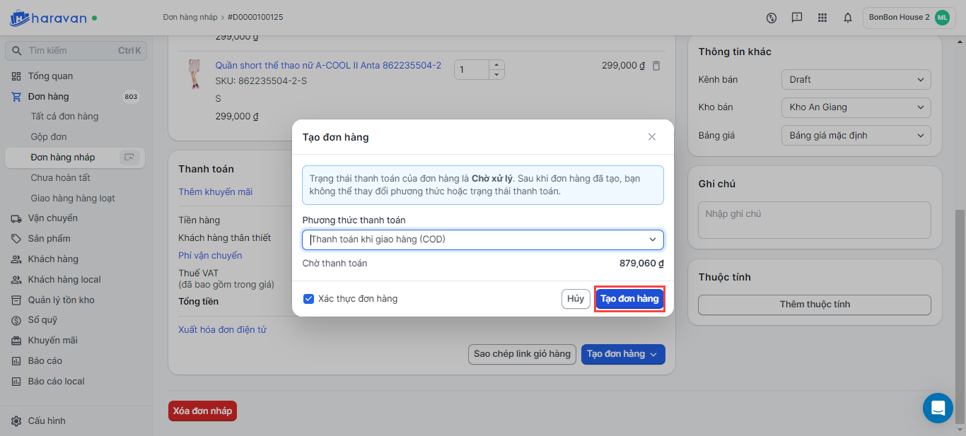 Nhà bán hàng vào đơn hàng nháp cần hoàn thành, chọn Tạo đơn hàng