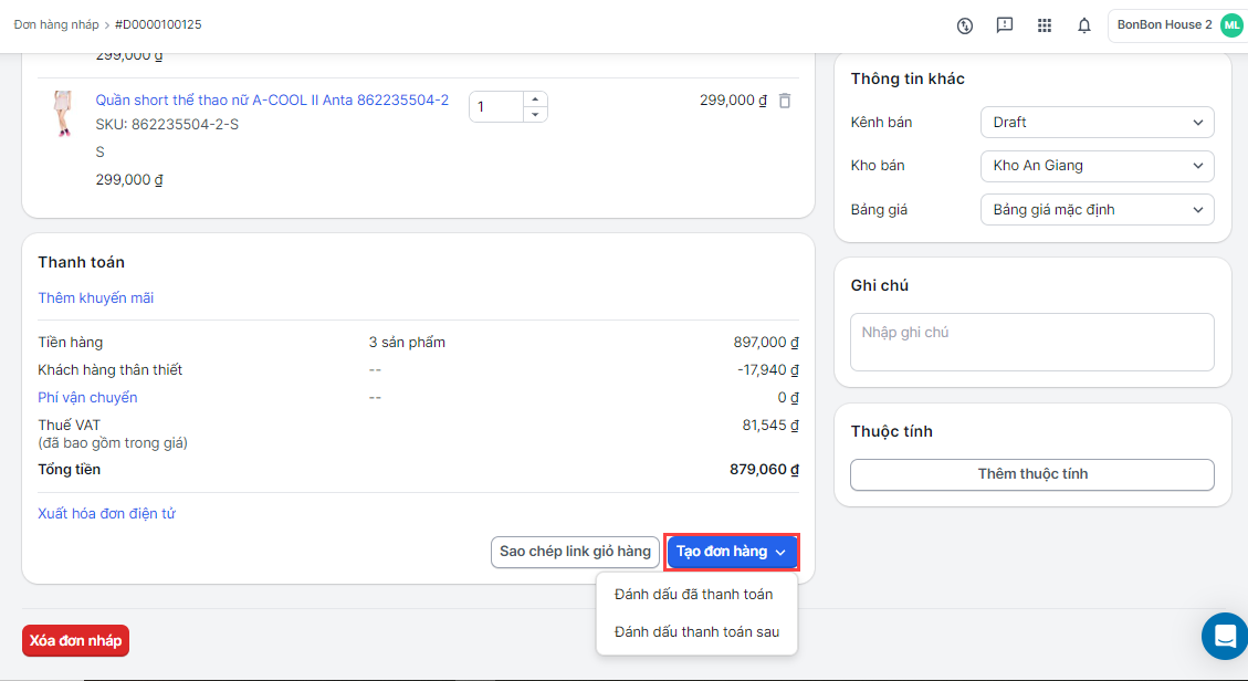 Cách 1**Tạo từ trang Đơn hàng nháp.**