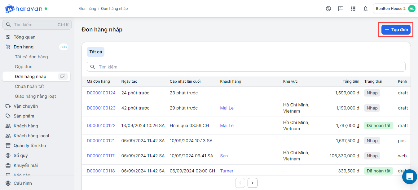 1. Nhà bán**vào mục Đơn nháp**và**chọn Tạo đơn**
