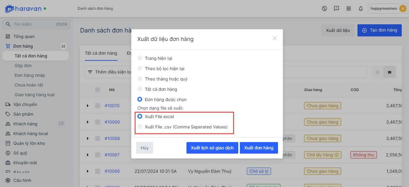 - Xuất dữ liệu đơn hàng được chọn: Nhà bán hàng cần chọn một số đơn trước khi chọn Xuất dữ liệu