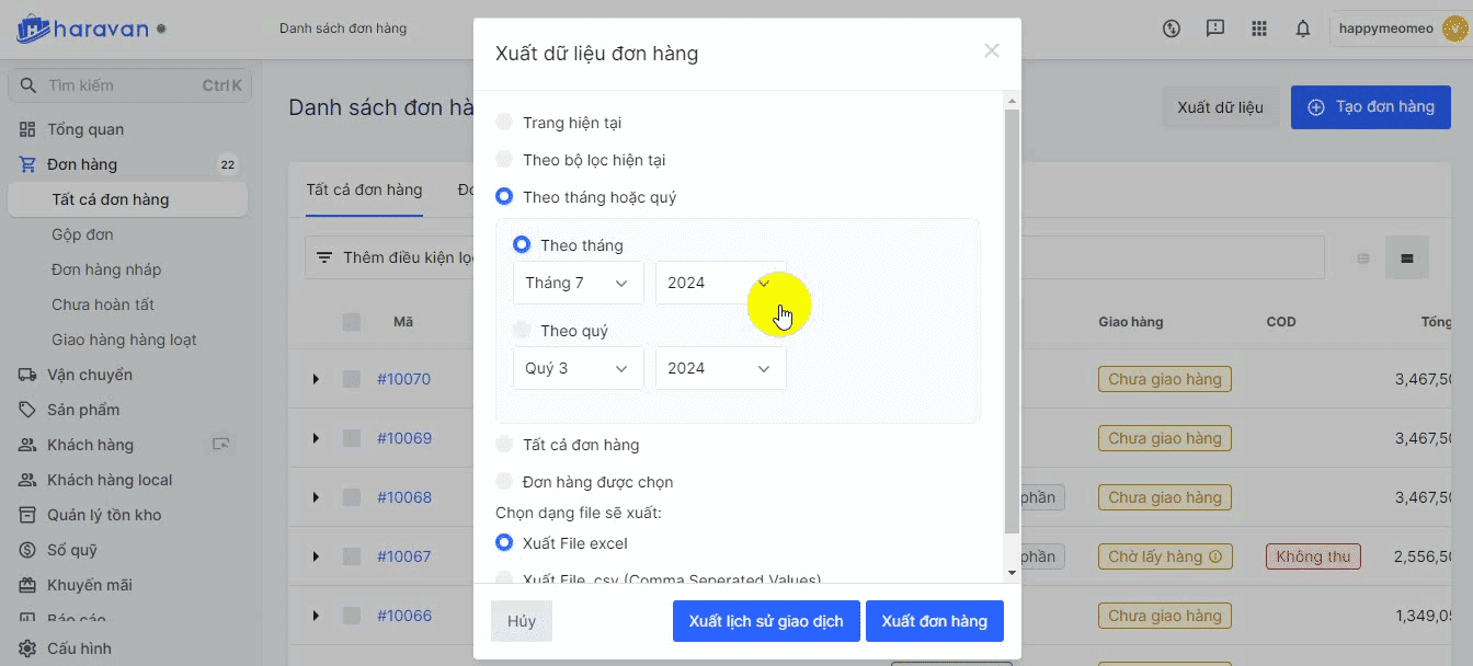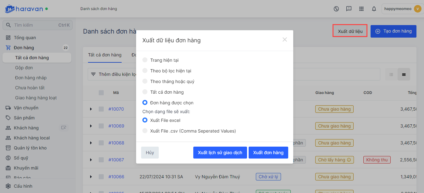 Xuất dữ liệu đơn hàng và lịch sử giao dịch