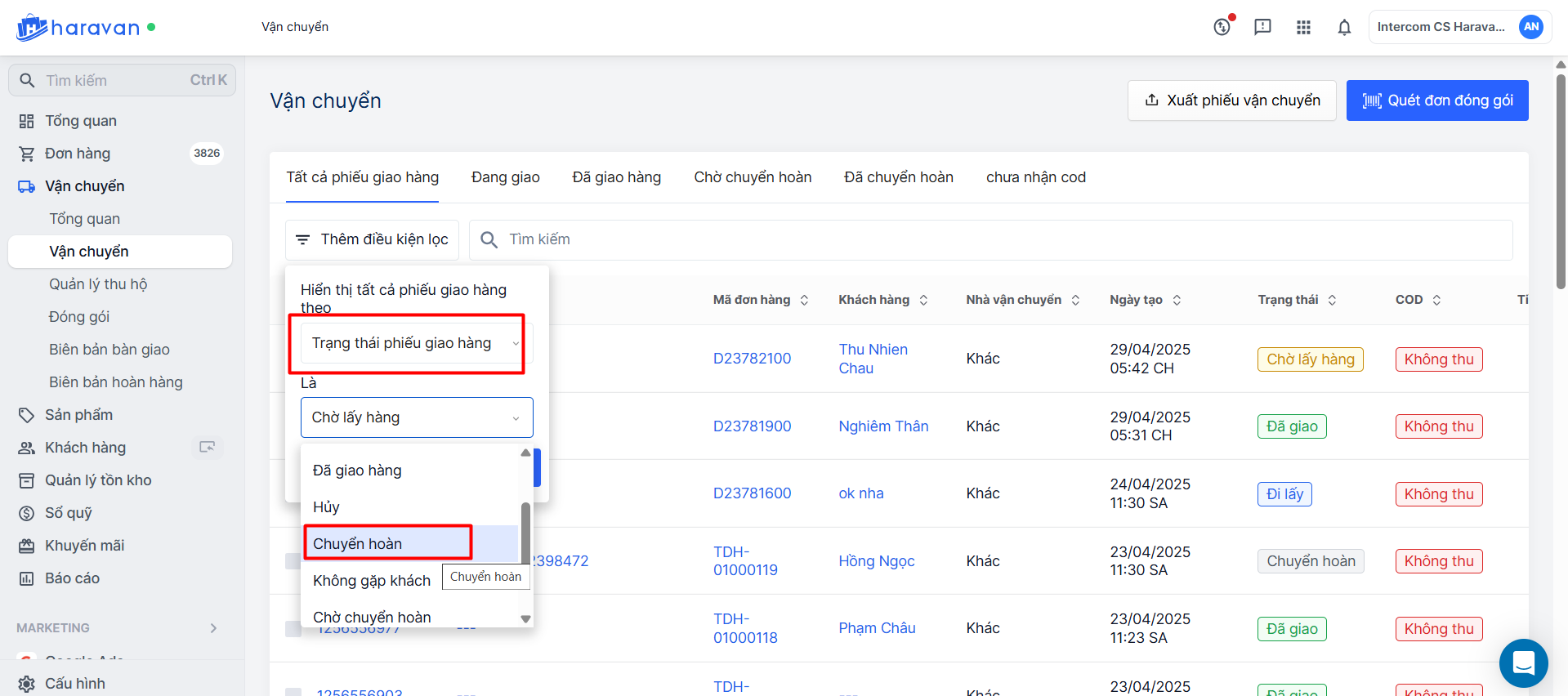 Để xuất file lọc được trạng thái chuyển hoàn bạn cần vào mục vận chuyển -> chọn Lọc theo trạng thái phiếu giao hàng -> chọn trạng thái cần lọc . Bạn xuất file tại đây để lọc các đơn hàng có trạng thái vận chuyển mong muốn.