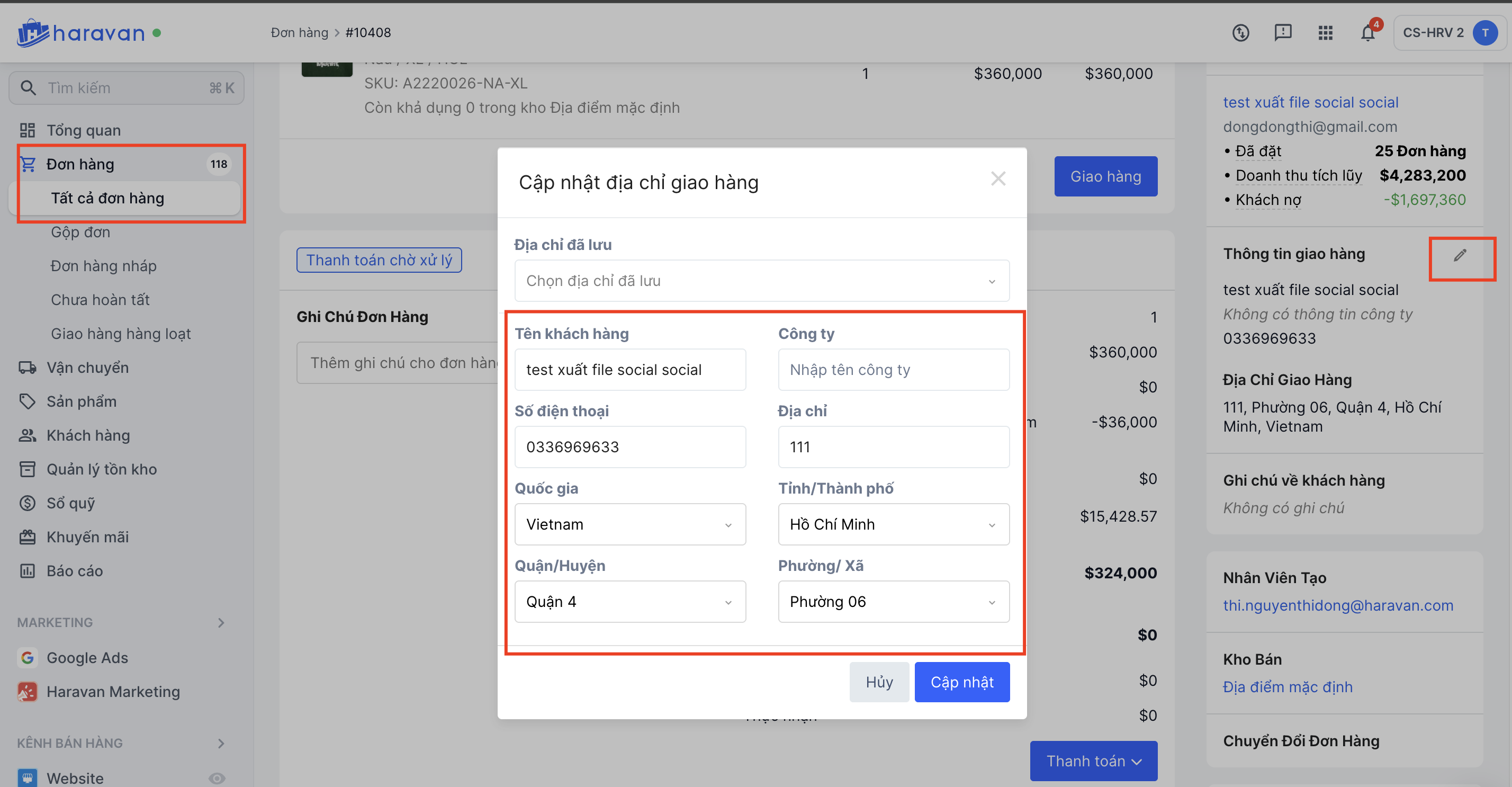 - Bấm cụ thể vào địa chỉ giao hàng tại mục đơn hàng, xem thử đã điền đủ các trường địa chỉ như bên dưới chưa: