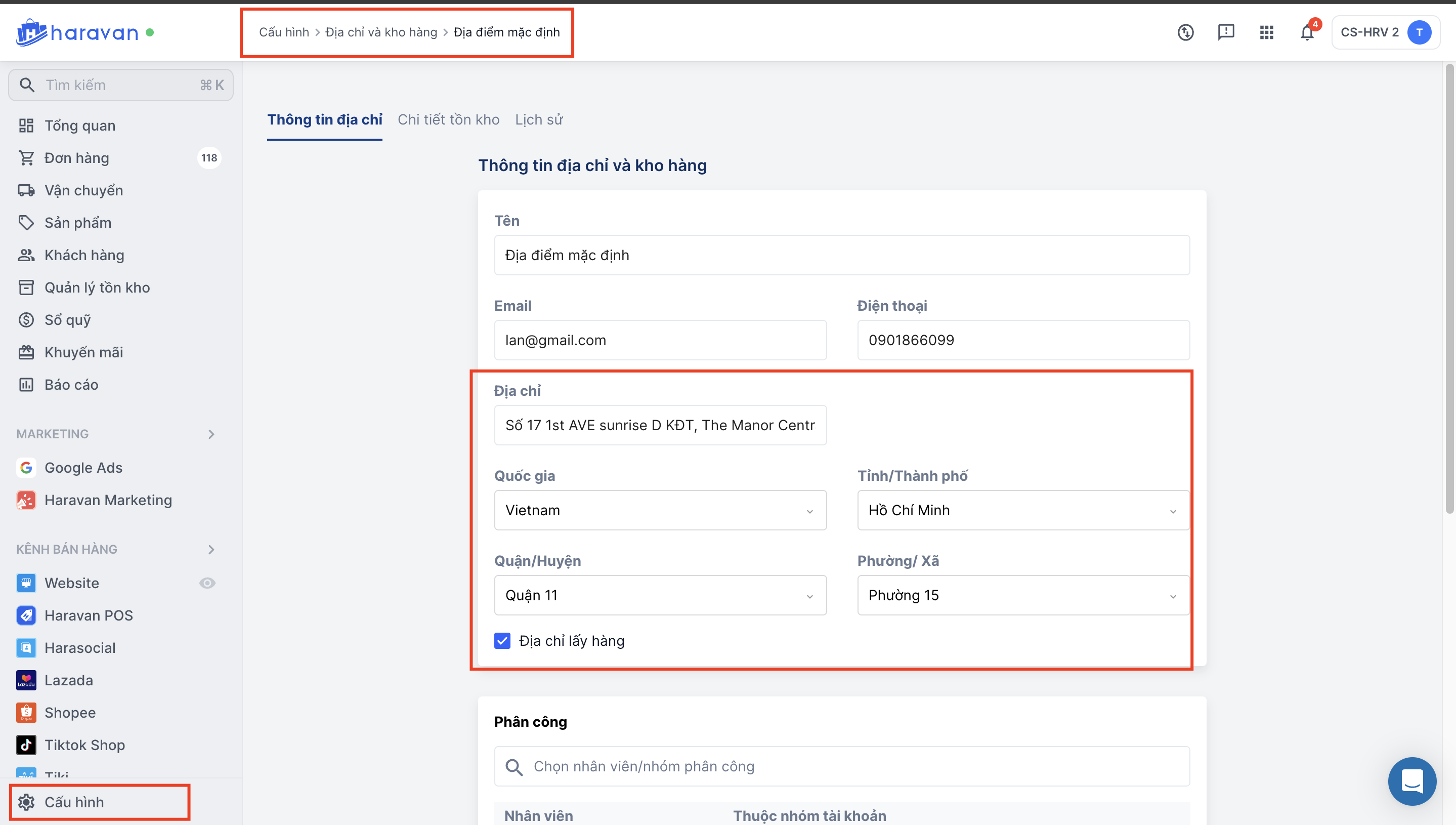 - Kiểm tra mục Cấu hình >> Địa chỉ và kho hàng: Xem kho hàng đã điền đủ các trường địa chỉ chưa: