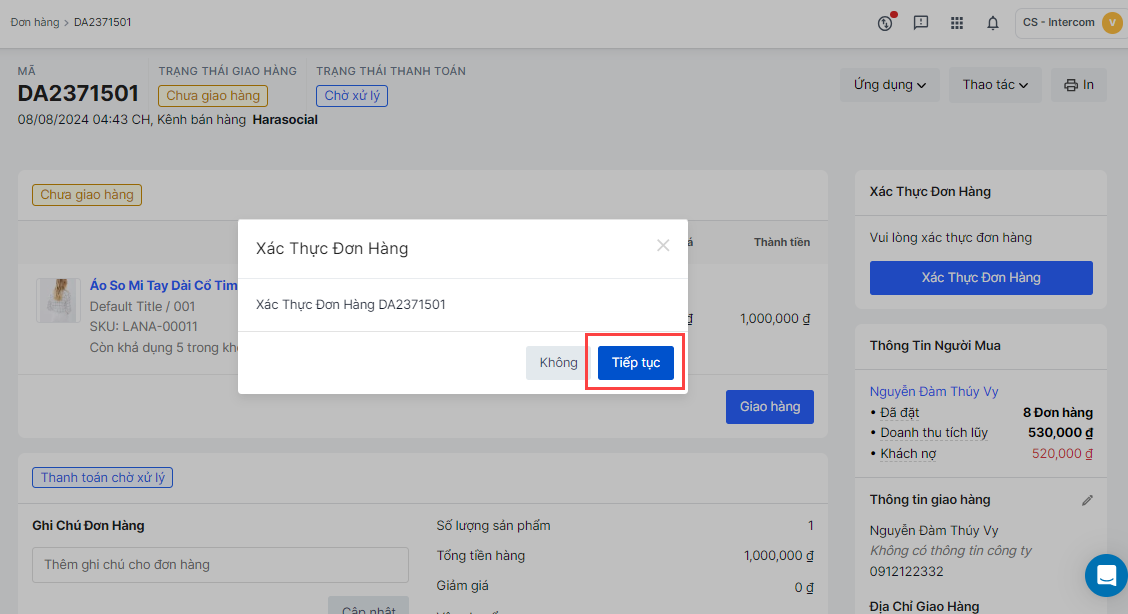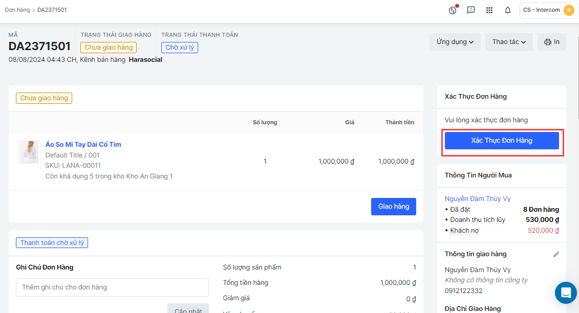 - Chọn Xác thực đơn hàng