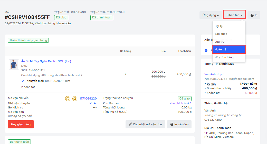 - Vào Tất cả đơn hàng, mở đơn cần hoàn