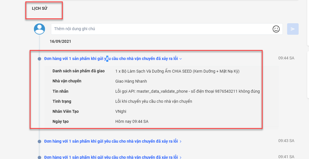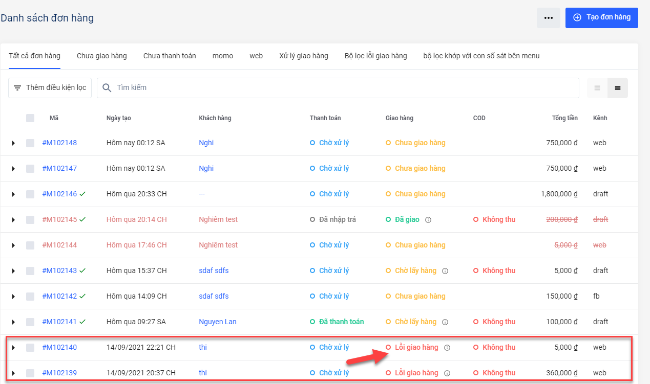 Khi phát sinh lỗi giao hàng, đơn sẽ có trạng thái Lỗi giao hàng.